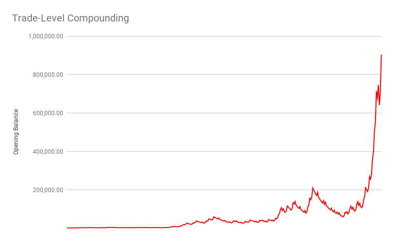 In this chart you see the exact same trades, exact same system, but instead of compounding at the account level, this is compounding at the trade level.